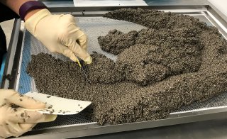 The very fragile eggs are then chilled and gently removed by hand from the membrane by rubbing the eggs against a mesh screen. The tissue is then removed for composting. The eggs are next rinsed repeatedly with cold water to wash away impurities, broken eggs, and membrane residues. Additional removal of crushed eggs and impurities is achieved by manual removal, using tweezers. The pure eggs are then poured into a fine mesh colander to remove the water.